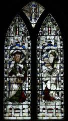 This four-light window depicts the Four Great Fathers of the Western Church—St Ambrose, St Jerome, St Augustine, and Pope Gregory the Great—framed beneath an elaborate Gothic canopy. In the tracery lights above unfolds a Last Judgement scene, in which Christ appears in glory surrounded by angels and the resurrected dead, reinforcing the doctrinal authority of the Fathers through the lens of divine revelation.
