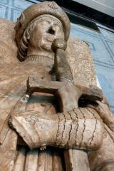 This funerary monument depicts Don García Osorio, a knight of the Order of Santiago, shown in repose with hands crossed upon his sword, a symbol of both chivalric honor and Christian faith. Carved in Toledo (1499-1505), probably by a sculptor influenced by Egas Cueman or Sebastián de Almonacid.