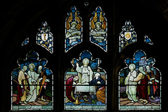 This stained glass window by Charles Eamer Kempe, at St Peter's Market Bosworth Leicestershire, is an example of late Victorian Gothic Revival art, depicting Saints George, Peter, and Margaret in three tall, richly colored panels. Each saint stands beneath an elaborate architectural canopy, rendered in delicate tracery and glowing jewel tones that catch and filter the light with remarkable depth.