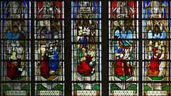 This window narrates episodes from the apocryphal infancy cycle concerning St Anne and St Joachim, parents of the Virgin Mary. Executed in the early sixteenth century by a Rouen workshop, the glass combines dense architectural canopies with clear, compartmentalised scenes, allowing the viewer to follow the story across multiple lights.