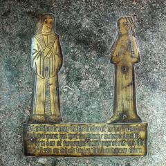 Monument sur pied avec des colonnes ioniques, métope en frise encadrant une plaque de cuivre représentant des figures agenouillées.