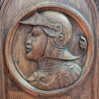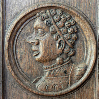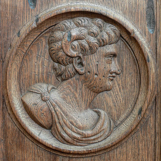 The vertical panels or bench ends of the Montrésor stalls are adorned with a series of carved medallions, each containing a bust presented in profile within a circular frame. These portraits, inspired by antique coins and medals, transform the sacred furniture into a humanist portrait gallery. Their craftsmanship suggests the work of an artist familiar with contemporary French courtly style, combining classical restraint with lively individuality.