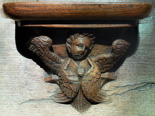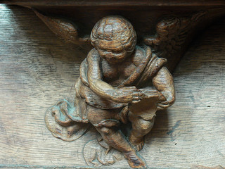 One depicts a seraph whose head and layered wings form a living bracket beneath the seat; the design fuses structural purpose with theological symbolism, its flowing feathers rendered in rhythmic precision. A winged child or putto intent upon writing upon a scroll, introduces the Renaissance ideal of divine inspiration and learning, recalling the recording angels of Italian art.