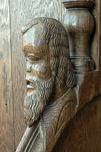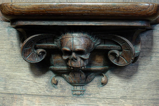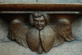 Another contrasts sharply with this vision of celestial purity: a skull framed by scrolls and mouldings, a stark yet beautifully modelled memento mori reminding the canons of life’s transience. A final carving, a cherub’s head enfolded in heart-shaped wings, restores the theme of redemption through gentle, compassionate expression.
