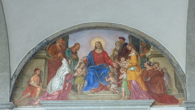 Toward the end of the fifteenth century, the loggia was enriched by Domenico Ghirlandaio’s fresco Christ Blessing the Children (c. 1486). The theme, drawn from the Gospel of Matthew (19:13–15), could not have been more appropriate for the hospital’s mission. Christ’s invitation, “Let the little children come to me”, finds literal expression in the Ospedale, where abandoned infants were received and cared for by the institution’s matrons.