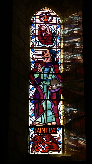 • Saint Luc est représenté peignant la Vierge à l’Enfant, selon la tradition qui le considère comme premier iconographe chrétien; son symbole est le bœuf.