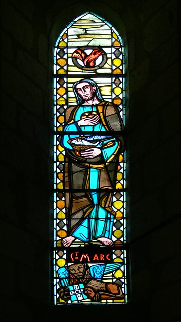 • Saint Marc tient les pains et les poissons, renvoyant aux miracles du Christ et à la nourriture spirituelle, avec le lion comme emblème.