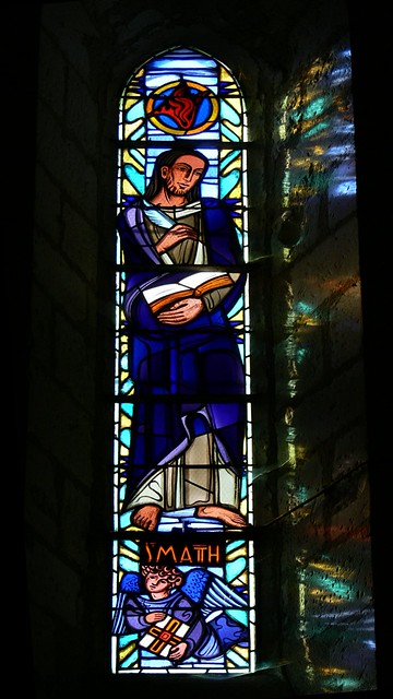 • Saint Matthieu est figuré écrivant dans un livre, soulignant l’auteur inspiré du texte évangélique, accompagné de l’homme ailé.