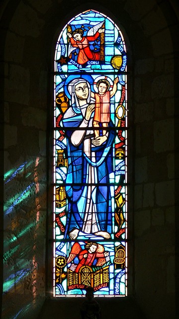 • La lancette centrale représente la Vierge à l’Enfant, Marie présentant l’Enfant Jésus de face, encadrée de motifs symboliques et d’inscriptions mariales.