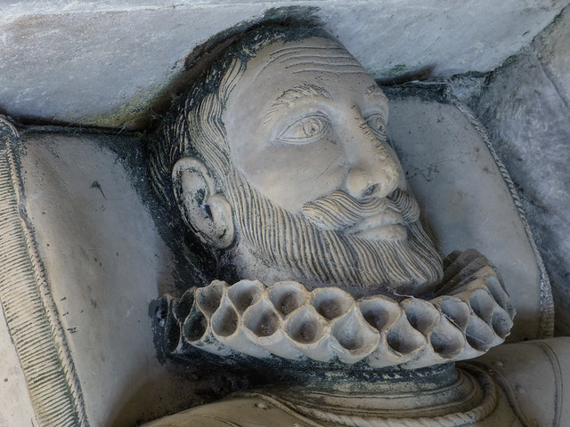 Woodhul is shown wearing late Elizabethan armour, including a breastplate, articulated arm defences, and a skirt of tassets, indicating his status as a gentleman of local standing rather than a professional soldier. Around his neck he wears a prominent cartwheel ruff, firmly anchoring the effigy stylistically to the period around 1600. His hands are joined in prayer, a gesture retained in English funerary sculpture after the Reformation as a sign of personal piety rather than intercessory devotion.
