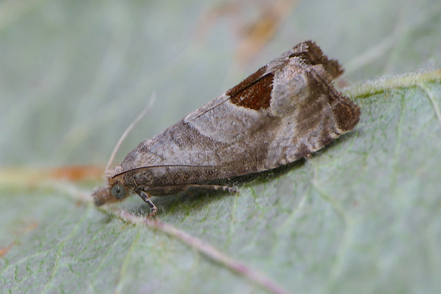Forewings are sharply patterned where the outer half is typically whitish or silvery, and the inner half is chestnut to dark brown, often with a darker triangular blotch. A at rest, the moth holds its wings in a roof-like posture, forming a compact shape.