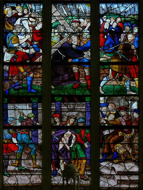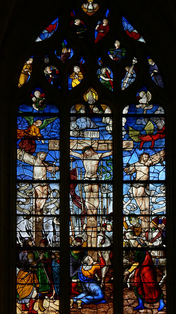 At the top of the window is the Crucifixion itself. Christ hangs on the central cross, flanked by the two thieves, with angels hovering above to receive the blood flowing from his wounds. Around the base of the crosses gather the Virgin Mary, Saint John, soldiers, and mourners, each figure animated by expressive gestures and faces of poignant realism. The deep blues and rubies of the sky and garments, combined with delicate grisaille shading, lend the scene both brilliance and gravity.