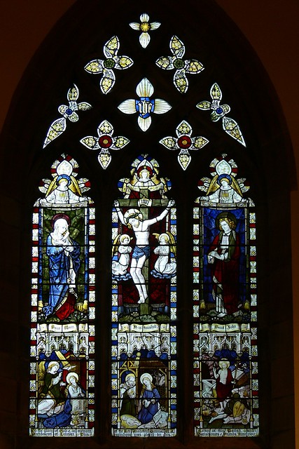 The window consists of three tall lancet lights surmounted by quatrefoil and trefoil tracery lights, all filled with imagery drawn from the Passion and Nativity of Christ. At the center is the Crucifixion of Christ. Christ is shown on the Cross, flanked by two mourning angels who hover on either side. In the predella panel, below is a Nativity scene.
