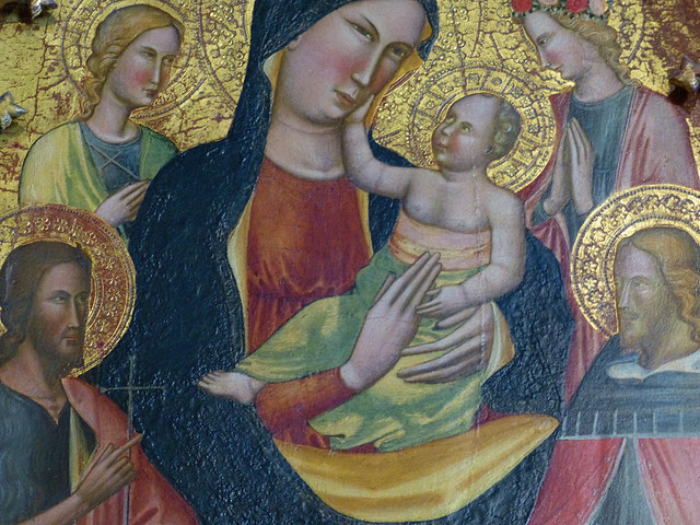This tempera and gold painting on wood of The Madonna and Child Between Two Saints by Lippo d'Andrea (Pseudo-Ambrogio di Baldese) is now in the Bargello Florence and is dated to between 1400 and 1425.
